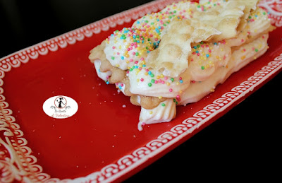 Sporcate con un po di crema il piatto da portata scelto e “incollate” sopra la prima sfoglia. Farcitela con la crema, cospargete con gli zuccherini e coprite con un’altra chiacchiera, procedete ancora con namelaka, zuccherini e decorate con una chiacchiera spezzettata. Procedete fino ad esaurimento ingredienti.
