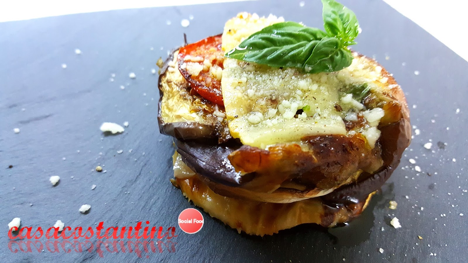 Con l’aiuto di un coppapasta, iniziamo a comporre la millefoglie. Alla base mettiamo una fetta di melanzana quindi un paio di fettine di pomodoro, qualche foglia di basilico ed una fettina di formaggio e ripetiamo la sequenza altre due volte. Terminate tutte le millefoglie, spostiamole sulla teglia, aggiungiamo un filo d’olio e passiamo in forno, a 180°, per 5′ prima di servire.