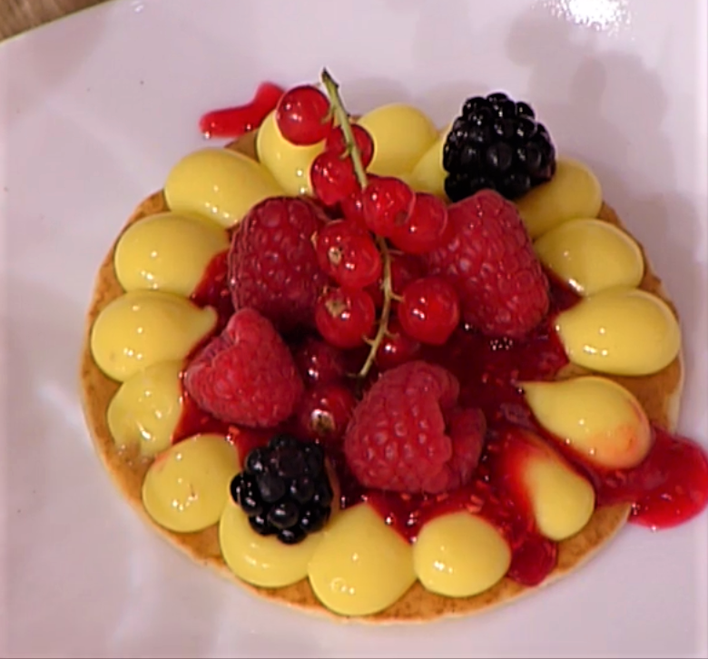 Composizione del dolce: Disporre un pancake sopra un piatto da portata e farcire con degli spuntoni di crema pasticcera.