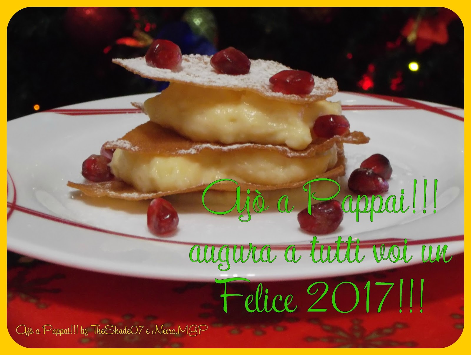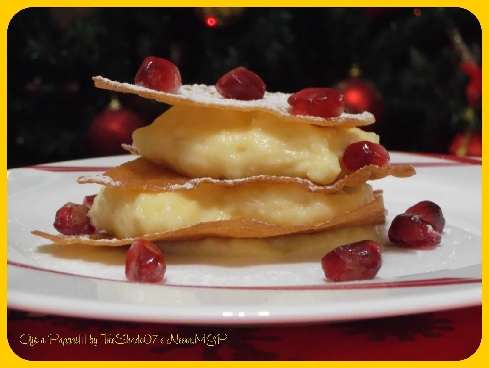 Ecco come preparare un dolce semplice e di grande effetto, perfetto per le festività o da sfoggiare in tavola per festeggiare con stile le occasioni importanti. Facile ed economico, decorato con gli arilli di melagrana, questo millefoglie rappresenta uno dei dolci della tradizione di Ajò a Pappai!!! che vogliamo regalarvi e condividere con tutti voi. Un dolce modo per augurarvi un prospero nuovo anno.