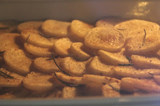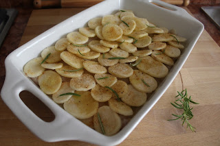 Sbucciare, lavare e tagliare a fettine sottili le patate (io ho utilizzato la mandolina). Scottarle in acqua bollente per 2-3 minuti, scolarle e tamponarle per togliere l’eccesso di acqua.