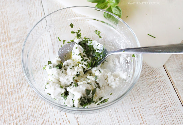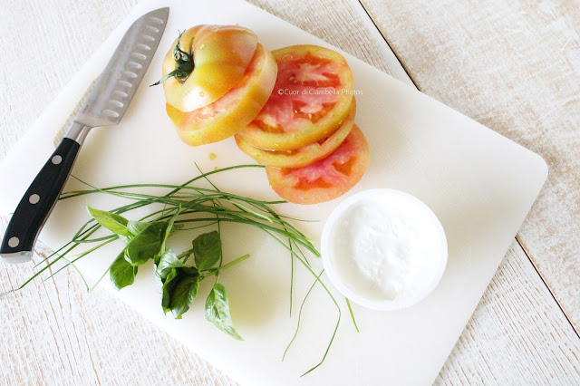 Tagliare il pomodoro in 3-4 fette orizzontalmente. Poi tritare a coltello (non c’è bisogno di sporcare un mixer per qualche fogliolina) basilico ed erba cipollina e aggiungerle alla ricotta assieme ad un goccio di olio evo e un pizzico di sale. Mantecare bene la ricotta.