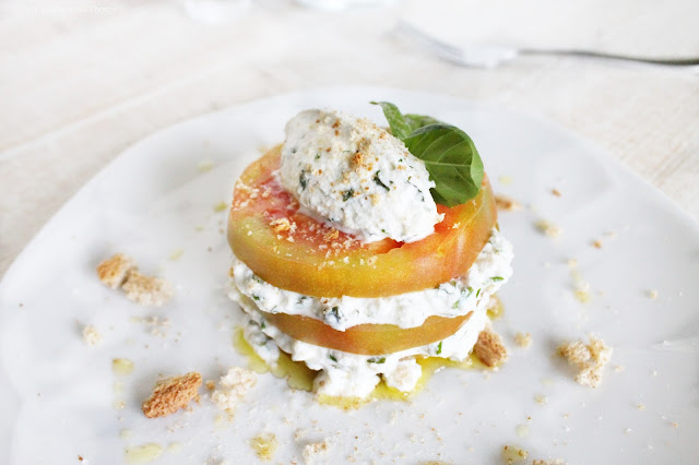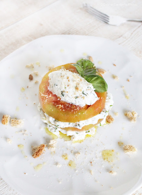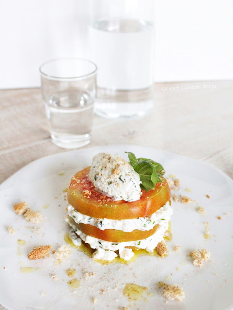 L’esecuzione è ovviamente molto semplice. Condire ogni fetta di pomodoro con sale in fiocchi (vedrete il risultato sarà nettamente migliore) e un filo di olio evo. Alternare le fette di pomodoro con la crema di ricotta.