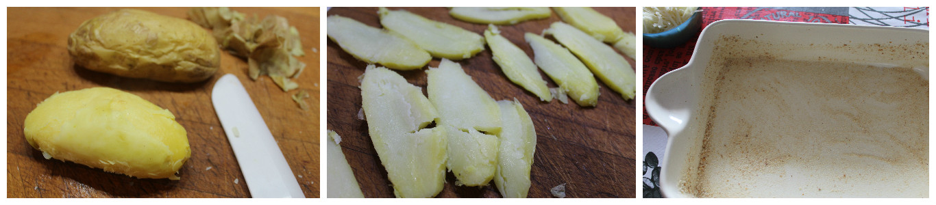 Lessate le patate per circa 6 minuti nel microonde alla massima potenza dopo averle forate con una forchetta. Lasciatele raffreddare sbucciate e tagliate anch’esse infette longitudinali.
