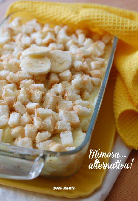 Volevo preparare la classica mimosa, ma non avevo le uova in casa ne per fare il pan di spagna ne per la crema pasticcera. Così ho preparato la crema senza le uova e in alternativa al pan di spagna ho usato i savoiardi. E ho aggiunto anche la banana per dare un sapore diverso alla classica torta mimosa, e devo dire che ci stanno veramente bene.