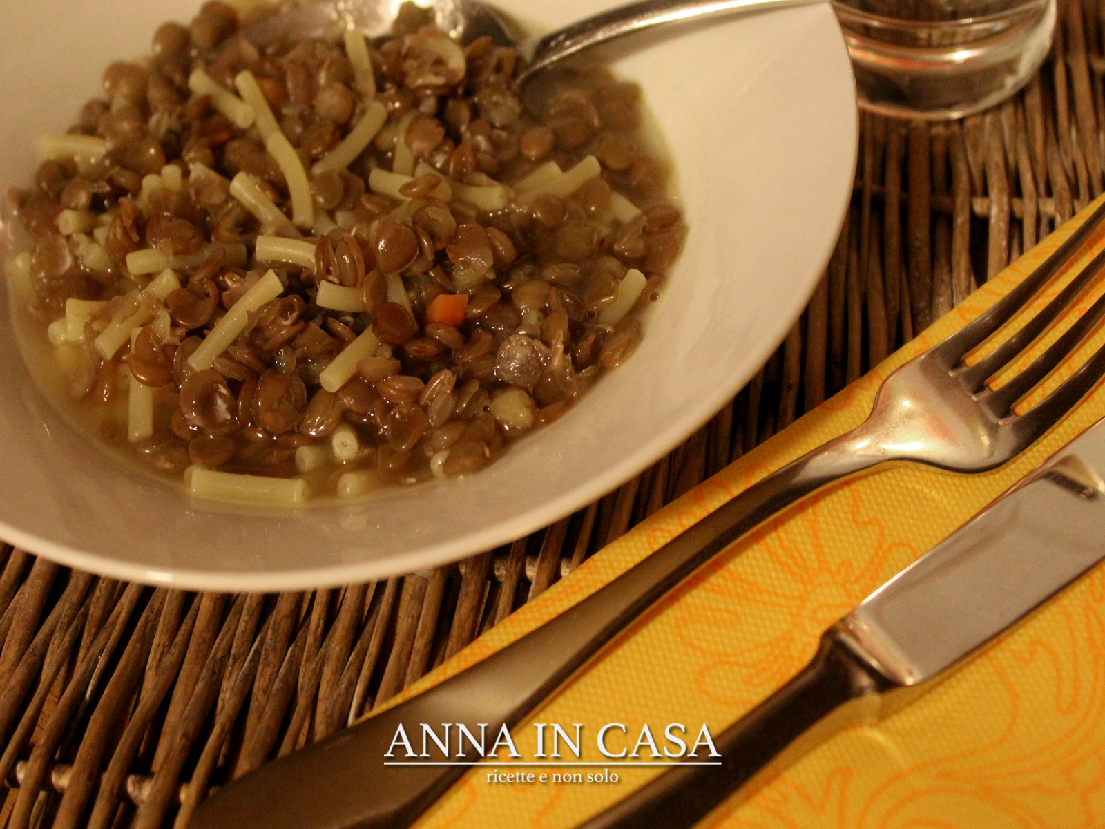 Una delle varie ciotole conteneva delle lenticchie, che il primo dell’anno ho servito passate in padella con un soffritto di sedano, carote e cipolle e aromatizzate con foglie di alloro, quindi ho pensato ad una minestra aggiungendo solo una manciata di pasta e del brodo di dado, semplicemente.