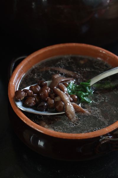 Il risultato? Una brodaglia dal forte odore, che è rimasta nei piatti di tutti. L’ho chiamata della “puerpera” perché nelle mie divagazioni per il web ho trovato che il liquido di cottura dei ceci neri veniva dato alle puerpere per rimetterle in forza.