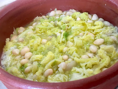 Sbucciate e tritate lo scalogno e versatelo in una padella capiente con lo spicchio d’aglio e fateli rosolare nell’olio evo per pochi minuti a fiamma bassa. Aggiungete la verza, copritela con acqua calda e fate cuocere per 15/20 minuti. Regolate di sale e unite i fagioli.
