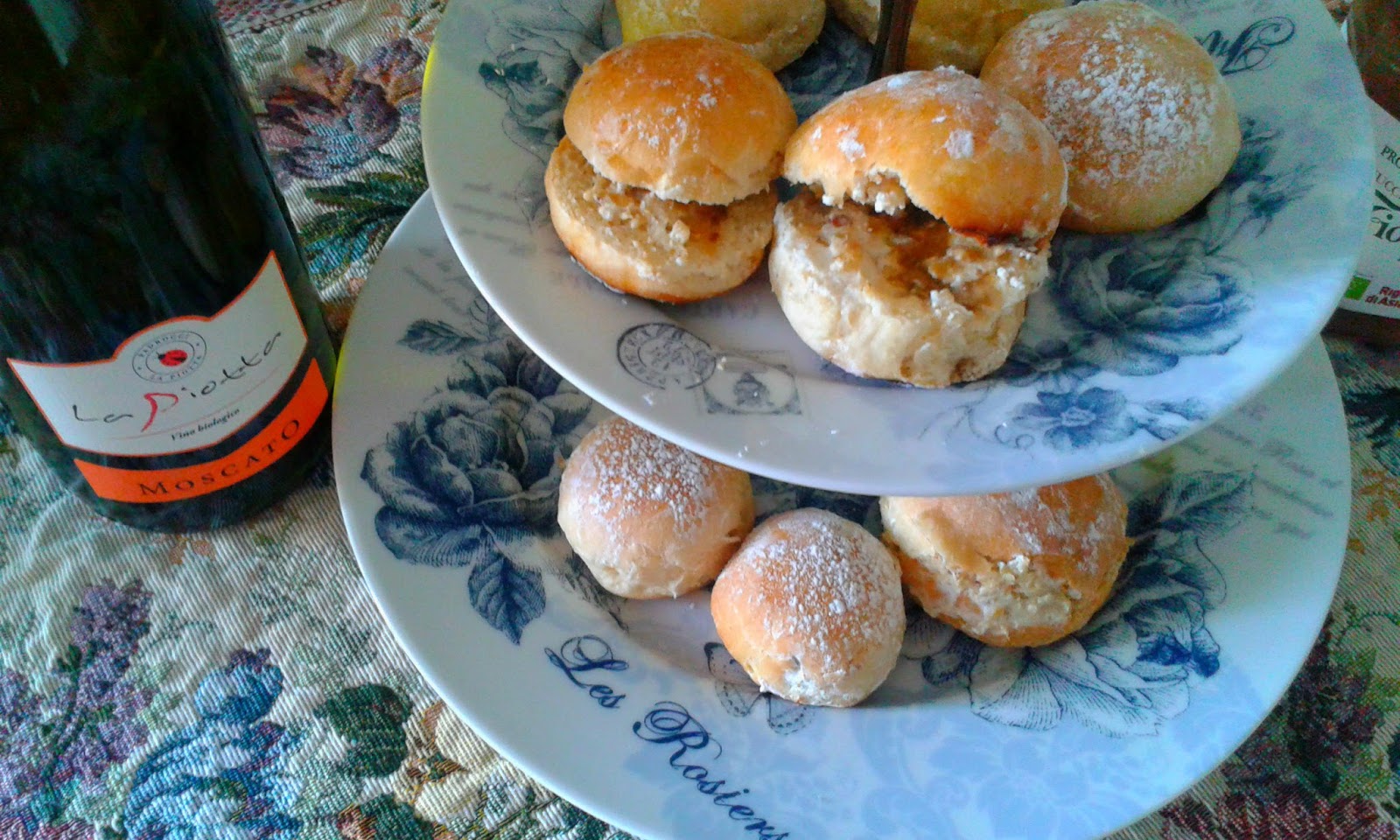Una volta cotti farcite con una crema di ricotta e fiordifrutta di pere e spolverizzate con zucchero a velo.
