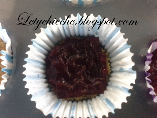 Dopo di ché riempite ciascun pirottino con due cucchiaini di marmellata all’amarena.