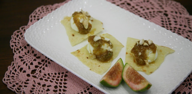 A questo punto disporre su un piatto da portata il pane carasau, aggiungere la crema di robiola, un cucchiaino di fichi caramellati e completare con gli anacardi.
