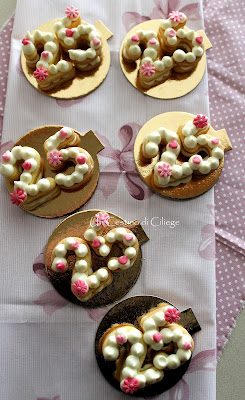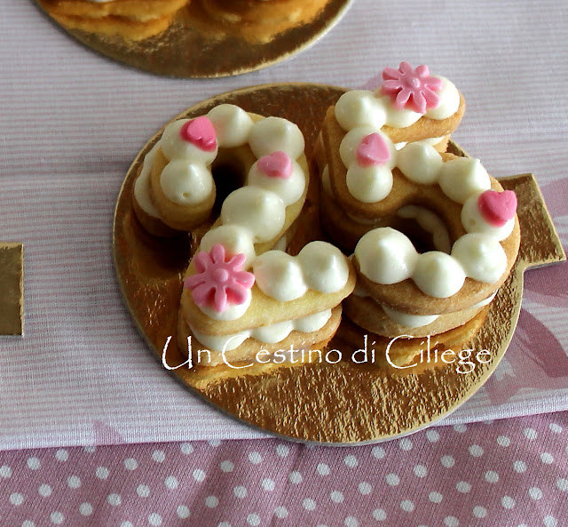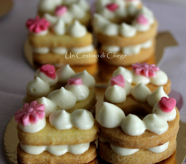 Le ho preparate con la ricetta della mia pasta frolla e farcite con namelaka al cioccolato bianco poi fiorellini e cuoricini in pasta di zucchero .