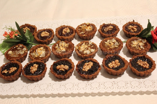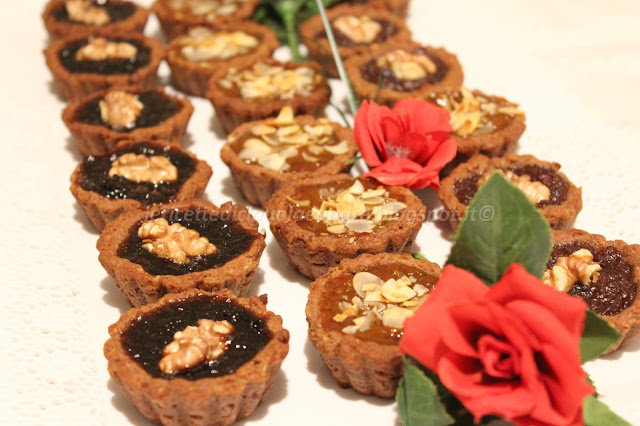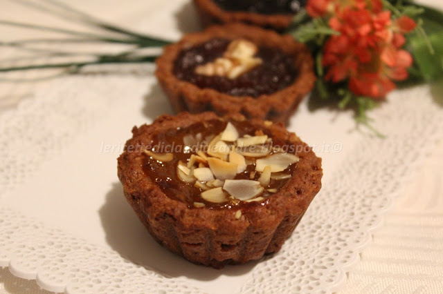Sbriciolare il pandoro e metterlo in una ciotola. Aggiungere la farina setacciata in precedenza con il lievito e la nesquik, il sale, il miele, la margarina morbida, l’uovo e lavorare il tutto per ottenere un impasto ben amalgamato. Coprire la ciotola e tenere nel frigo anche per un’oretta. Tirare fuori l’impasto, dividerlo in due e tirarlo in una sfoglia di circa 3 mm, tra due pezzi di carta da forno. Con uno taglia biscotti, ricavare dei cerchi e metterli nei stampini, io ho usato stampini in silicone, senza imburrarli, ma se non dovessi averli, imburrare pure gli stampini che usate. Riempire con un cucchiaino di confettura a piacere, io ho usato due tipi di prugne che avevo già aperti nel frigo e ho decorato con gherigli di noci e con confettura di albicocche, decorando con delle lamelle di mandorle.
