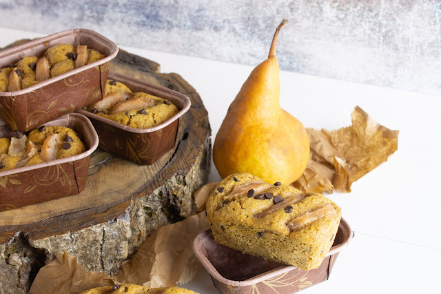 Per questi mini plumcake ho tratto ispirazione dai muffin vegani alle pere della mia omonima, Erika, autrice del blog “La tana del coniglio“. Ho solamente modificato qualche ingrediente in base a ciò che avevo in dispensa e aggiunto le gocce di cioccolato. Davvero davvero golosi, ve lo garantisco!!