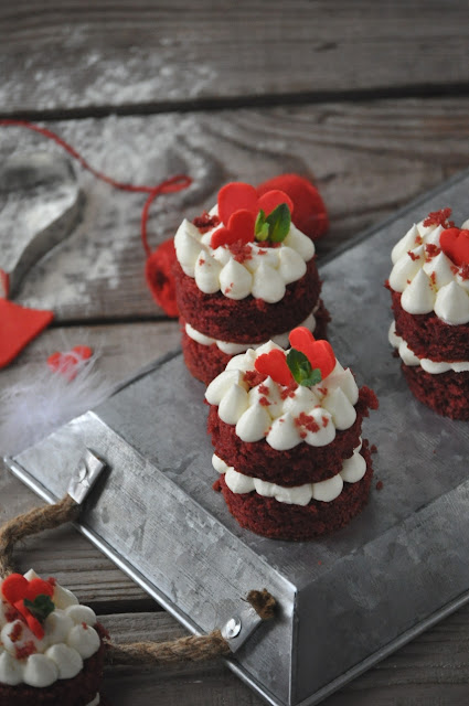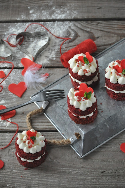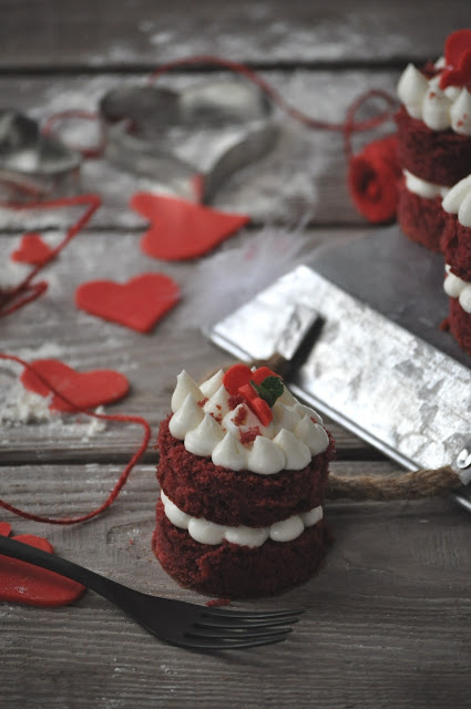 La festa tanto odiata o tanto amata da tanti, si sta avvicinando. Mancano pochi giorni all’immancabile appuntamento per i romantici di tutto il mondo: San Valentino! Oltre a rose rosse, cenette romantiche a lume di candela, serenate d’altri tempi, non poteva mancare lei: la torta. In tutte le sue forme, in tutte le sue espressioni accompagna da sempre i momenti cruciali e romantici delle nostre vite e dei nostri amori. Prove tecniche quindi in anticipo quest’oggi. Mini Red Velvet, piccole, spettacolari e bianchissima che desideravo preparare da tempo. Simbolo della pasticceria americana. Maestose e super golose, resa romantiche da cuori rosso fuoco di pasta di zucchero, accompagnerà sicuramente la mia e, spero, la vostra serata “tutta miele e coccole”.