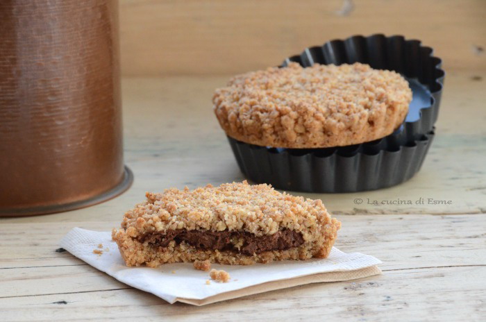 Prima di tutto mettete il burro a sciogliere e lasciatelo poi raffreddare. In una ciotola unite la farina setacciata con il lievito, lo zucchero e un pizzico di sale. Mescolate e quindi unite il burro sciolto e ormai freddo. Per mescolare inizialmente usate una forchetta, poi unite l’essenza di vaniglia e l’uovo amalgamate agli altri ingredienti passando a lavorare l’impasto con le mani, otterrete così delle grosse briciole. Con una parte delle briciole ricoprite il fondo degli stampini precedentemente spennellati con del burro fuso, quindi distribuite su ognuno un pò di Nutella, precedentemente ammorbidita nel microonde o a bagnomaria. Ricoprite con le briciole rimaste formando uno strato piu sottile di quello della base. Infornate a 180°C in modalità statico per circa 30 minuti. Sfornate e lasciate intiepidire i dolci prima di rimuoverli dagli stampini, poi poneteli a raffreddare completamente su una gratella per dolci.
