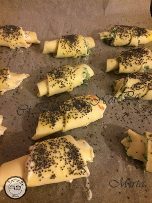 Disporli sulla carta forno e arrotolare gli spicchi realizzando così dei cornetti.Spennellare su ogni cornetto dell’uovo sbattuto e cospargerli di semi di papavero.