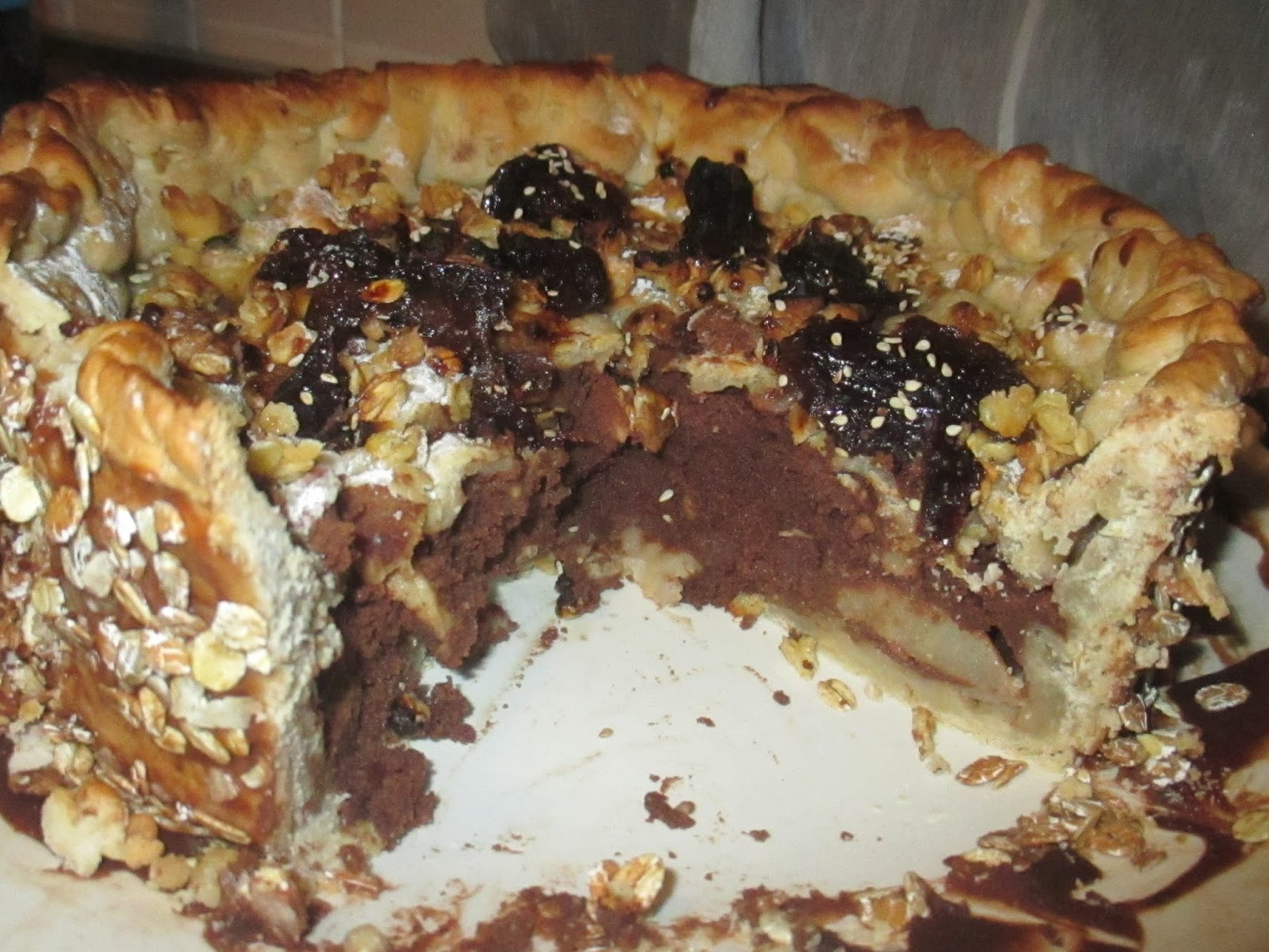 Prendre la pâte et ne tirez pas très subtile. Beurrer un moule de diamètre de 19 cm avec de hauts côtés et placer sur le dessus de la pâte. Couper les poires et les placer sur le fond de la pâte. Verser sur la farce de chocolat puis terminer en haut avec des pommes. Cuire au four à 180 degrés pendant environ 1 heure. Une cuisson obtenue, a terminé en haut, ajouter les noix et les céréales. Mettre au four à 140 degrés et poursuivre la cuisson pendant encore 10 minutes. Retirer du four et badigeonner les bords avec un mélange de sirop d’érable et le lait. Ajouter les prunes, les muesli et le sucre glace. laisser refroidir complètement et servir.