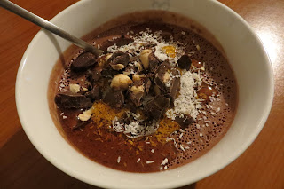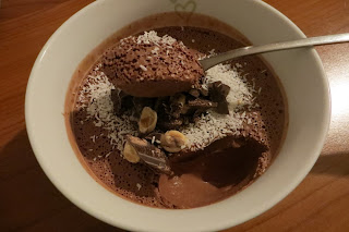 Frullare ad alta velocità tutti gli ingredienti per un paio di minuti e versare in due vaschette. Tenere in frigo qualche ora, spezzettare un po’ di cioccolato e decorare la mousse aggiungendo altro sciroppo d’acero nocciole e cocco.