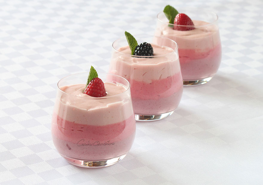 Il risultato è bello e buono: tre strati golosi e con diverse sfumature di rosa e porpora, in un connubio che va dal sapore più dolce (la mora) per passare a un pizzico di acidità (il lampone) e ritornare a un dolce non troppo dolce della fragola. Wow! Chi state aspettando ancora? Correte a prepararla!