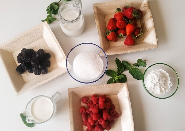 Come quantità abbiamo usato la dose di frutta che normalmente si trova nei cestini piccoli, 125 grammi. Però ricordatevi di prendere qualche frutto in più per la decorazione: guardate quanto stanno bene in cima, con una fogliolina di menta!