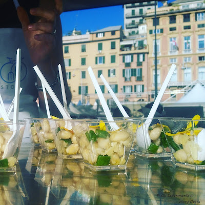 In occasione di On the Road, Marco Damele ha realizzato dei gustosi ed originali bicchierini Finger Food con Fagioli Bianchi di Pigna, piccolo comune dell’Imperiese ai piedi del Parco Naturale Regionale delle Alpi Liguri, Cipolla Egiziana e Petali di Calendula Officinalis.