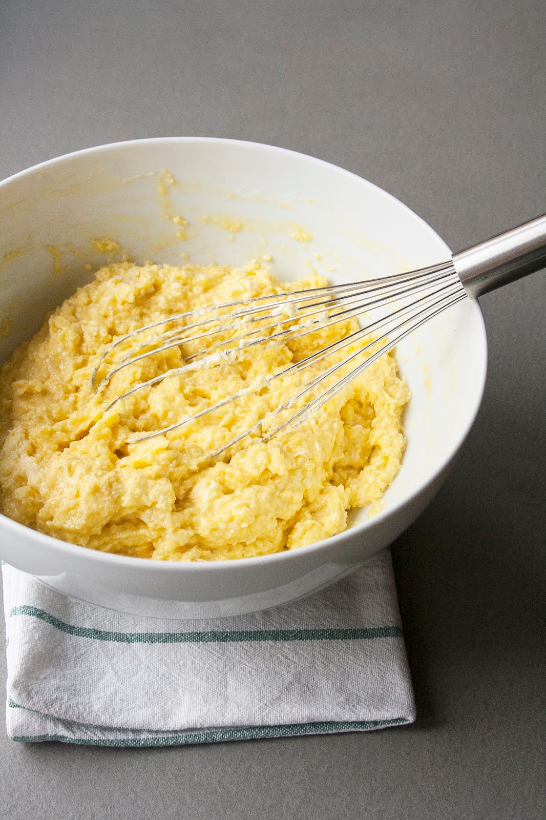 In una ciotola unite il burro fuso ma tiepido, il latte di cocco e le uova sbattute e mescolate per bene.