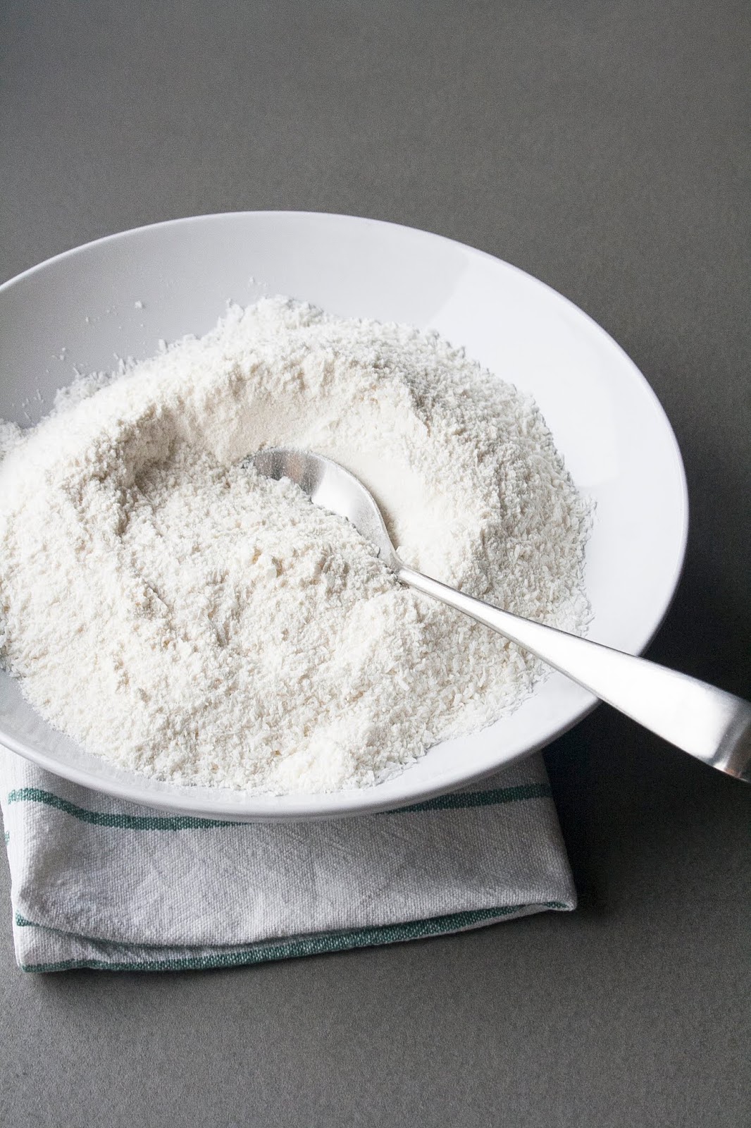Poi in una seconda terrina unite gli ingredienti secchi: la farina 00, lo zucchero semolato, la farina di cocco e il lievito in polvere e mescolate.