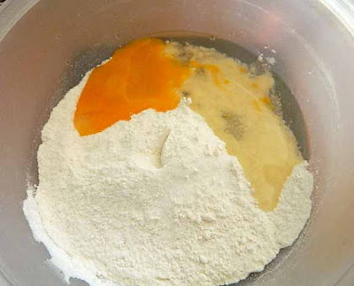 In una ciotola mettiamo tutti gli ingredienti secchi, farina, zucchero e lievito,