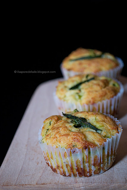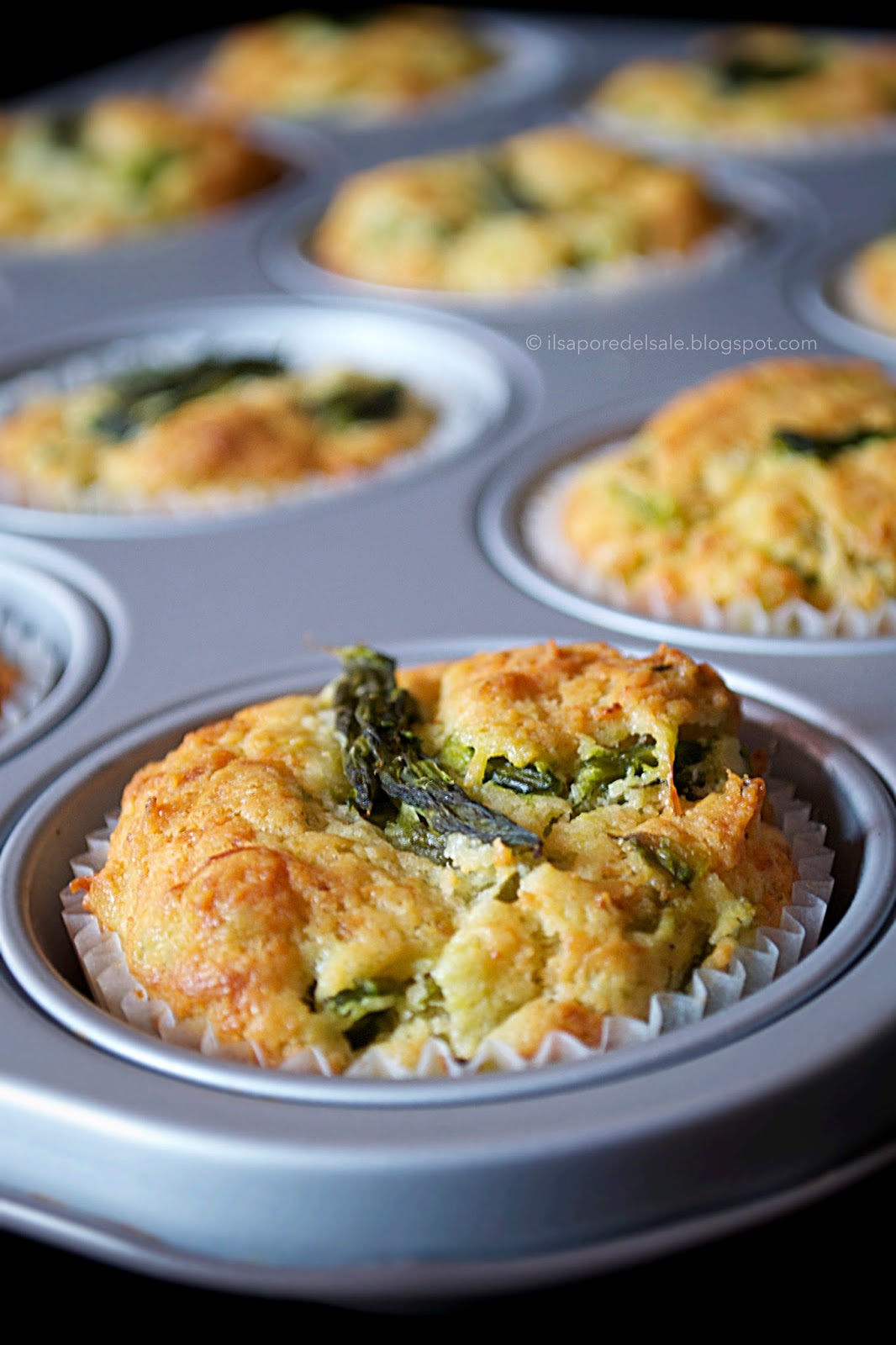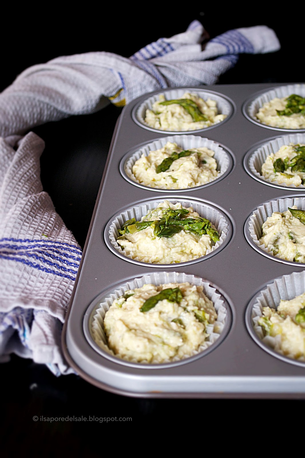 In una ciotola amalgamate bene le uova con la ricotta, il parmigiano e l’olio e correggete di sale e pepe. Unite quindi gli asparagi tagliati a tocchetti, ricordando di lasciare da parte le punte. In un’altra ciotola setacciate insieme farina e lievito e poi incorporateli agli ingredienti liquidi. Mescolate poco e rapidamente il tutto per ottenere un composto omogeneo e poi versate l’impasto nei singoli stampi riempiendoli per 2/3. Adagiate quindi la punta degli asparagi sulla sommità di ciascun muffin e infornate.