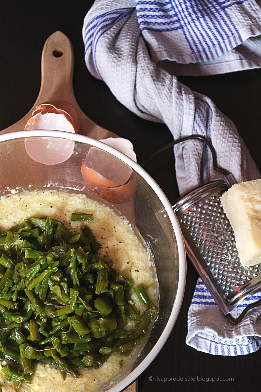 Per prima cosa lavate e pulite bene gli asparagi, togliendo la parte bianca finale. Procedete quindi alla cottura in abbondante acqua salata utilizzando l’apposita pentola (alta e stretta) o quella che avete a disposizione. Cuocete gli asparagi per 10/15 minuti a seconda della grandezza. Una volta cotti, scolate gli asparagi e tagliateli a tocchetti abbastanza piccoli, separando con cura la cime e lasciandole da parte. Lasciate quindi raffreddare il tutto.