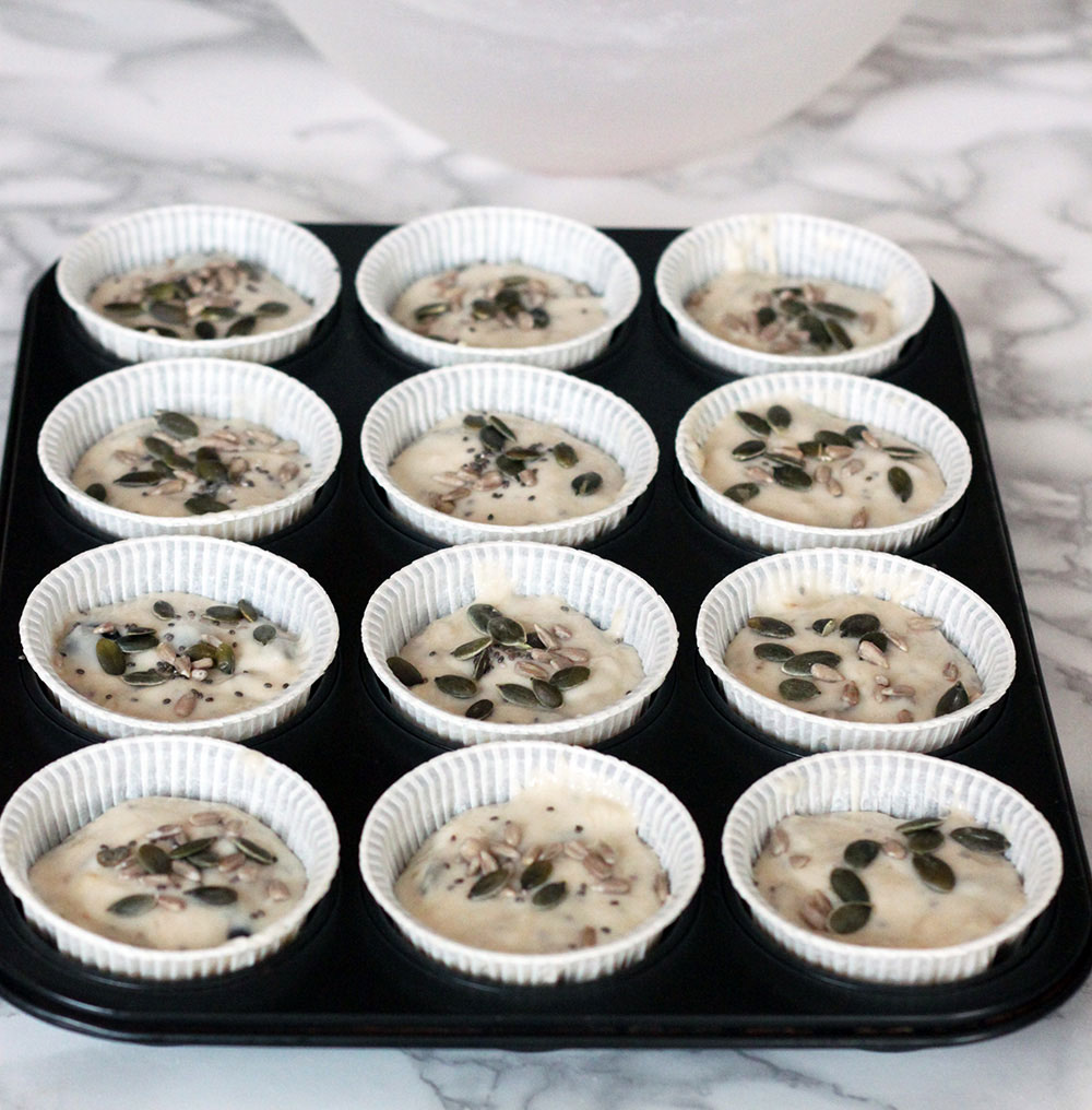 Riempite gli stampini di carta per muffin a tre quarti della loro capienza.