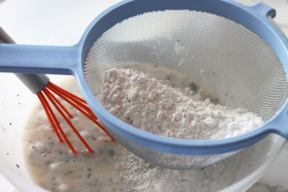 Versate la farina e il lievito un po’ alla volta, setacciandoli. Mescolate bene.