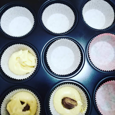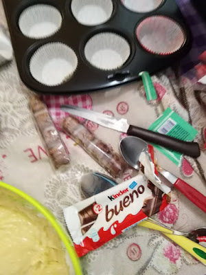 Al centro di ogni muffin inserite un pezzo di kinder bueno e ricoprite con il restante impasto.