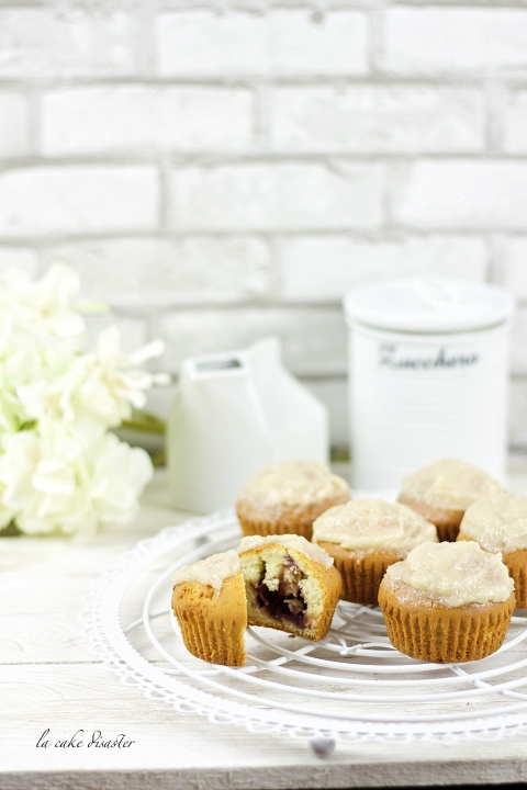 Non si può iniziare una nuova settimana senza un buon dolcetto…ed oggi parliamo di muffin donuts…dal cuore ripieno di confettura…con glassa al burro, zucchero e burro di arachidi…ottimi per iniziare la giornata, irresistibili davanti ad una tazza fumante di tè…! La ricetta originale è della bravissima Laurel Evans, io l’ho riadattata e modificata…