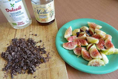 Spezzettare il cioccolato e tagliare i fichi a fettine.