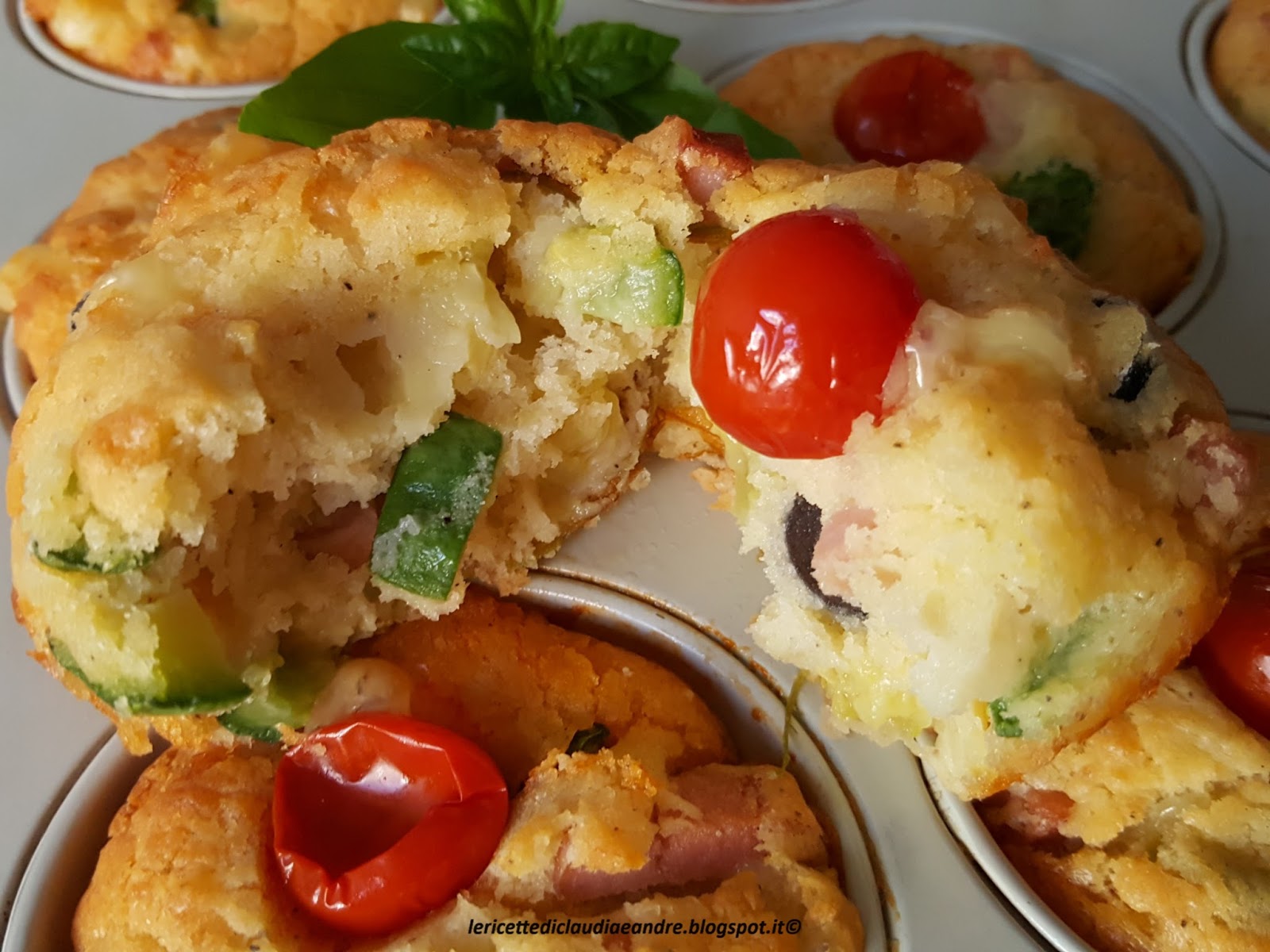 Muffin salati con zucchina, formaggi, olive e wurstel affumicato