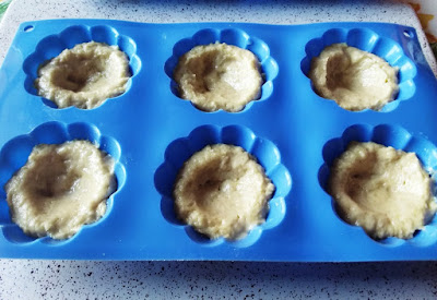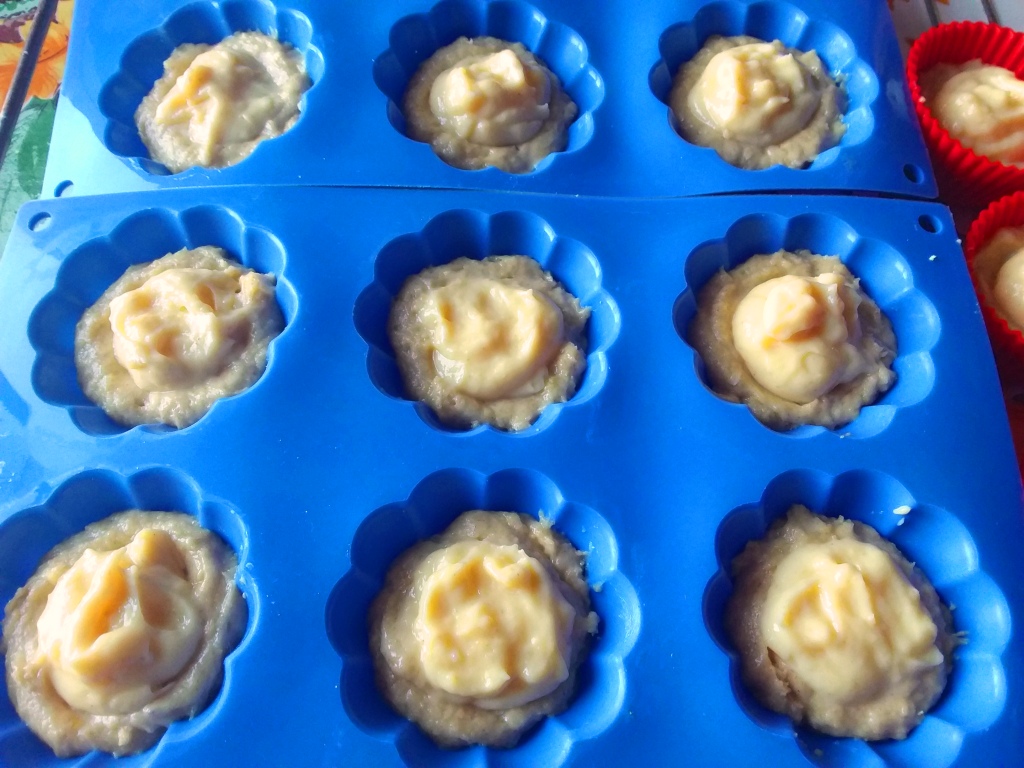 - Imburrare e infarinare degli stampini da muffin, poi riempirli con l’impasto poco sopra la metà. Con le dita bagnate premere al centro per formare una conchetta.
