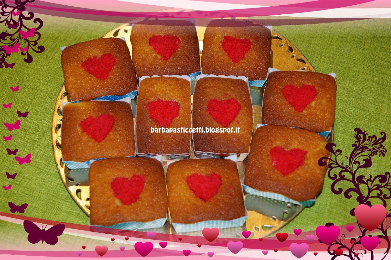 Ricavare dall’impasto colorato utilizzando uno stampino taglia pasta a forma di cuore, tanti cuoricini quanti sono i muffins quindi sempre con lo stesso stampino togliere il centro di ogni muffin ed inserire al suo posto il cuore rosso.