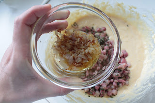 - Uniamo al composto anche la pancetta e gli scalogni.