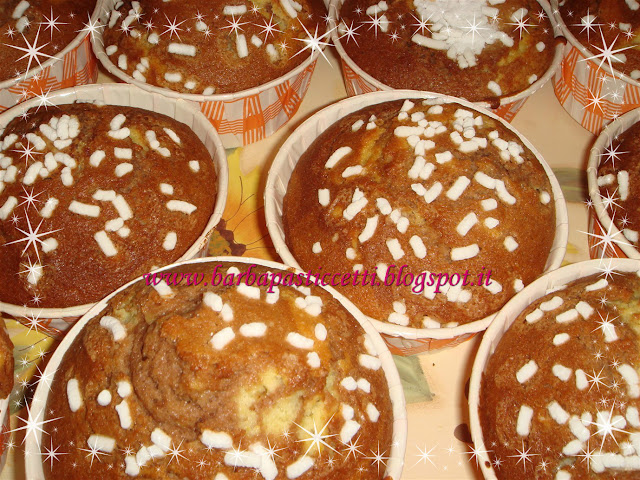 In stampini di carta per Muffins, riempiendoli per i 3/4 della loro capienza, versare i due composti alternando un poco di impasto bianco a quello scuro e così via via.