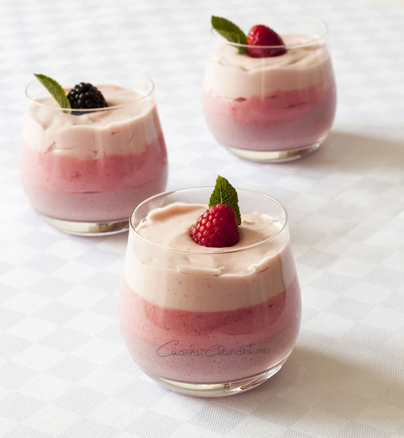 English. Place each mousse into a piping bag. Pipe a layer of mulberries mousse at the bottom, then go on with a layer of raspberry mousse and finally one of strawberries mousse.
