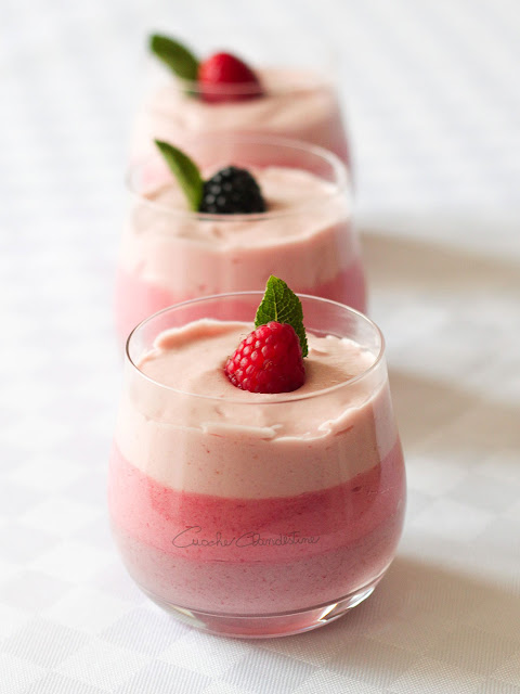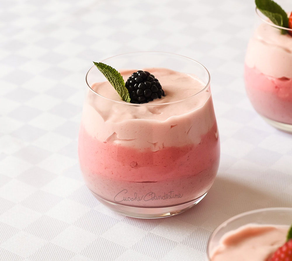 English. Strawberries, raspberries and mulberries are the basis of this delicious layered mousse, low in fat and in sugar.