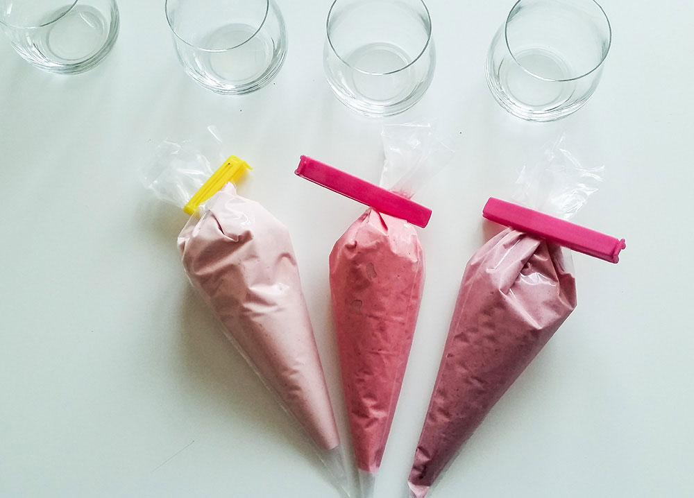English. Place each mousse into a piping bag. Pipe a layer of mulberries mousse at the bottom, then go on with a layer of raspberry mousse and finally one of strawberries mousse.