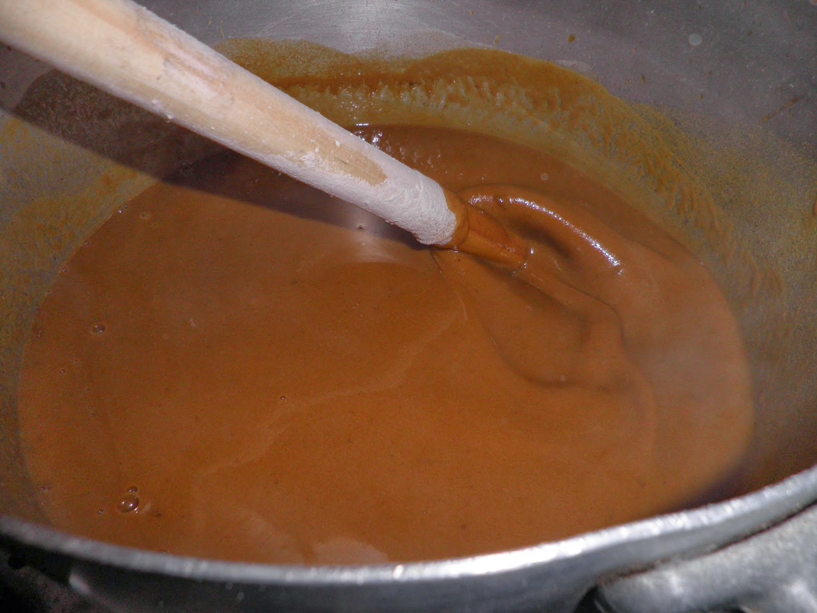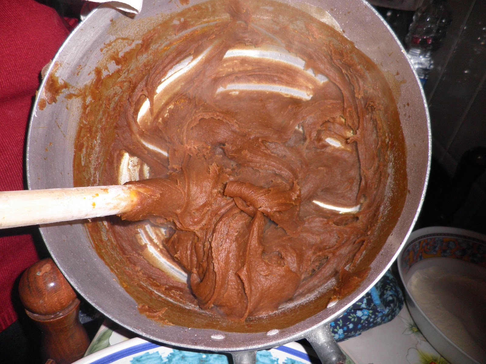Mettete quindi sul fuoco, non troppo vivace, e continuando a mescolare aspettate che si addensi. Diventerà un ammasso molto colloso che tende a staccarsi dal fondo della pentola. Prima di togliere dal fuoco aggiungete la buccia d’arancia e la cannella.