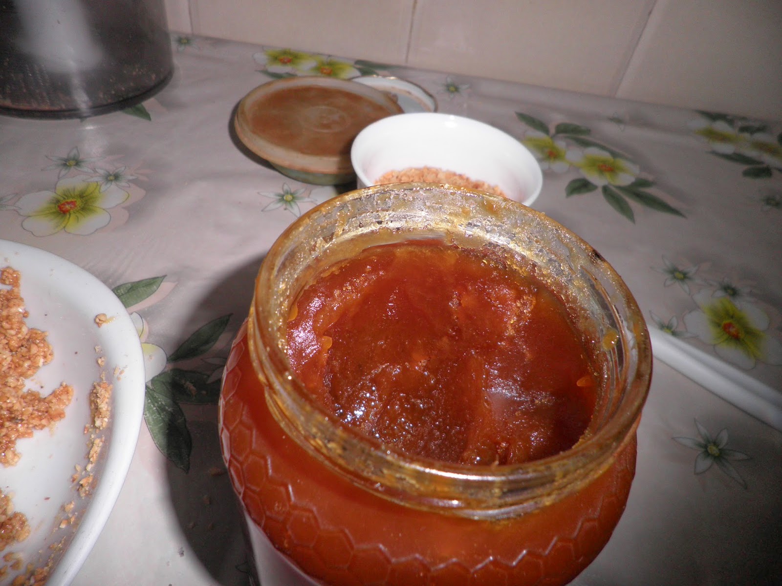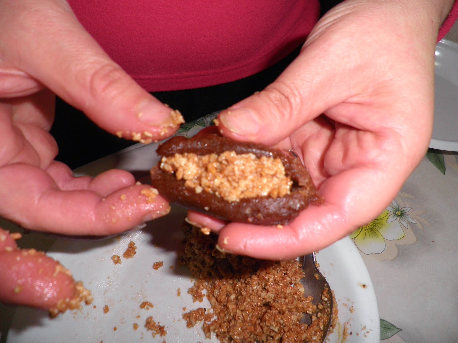 Mentre sono in forno preparate il ripieno impastando le mandorle con il miele (ho usato quello di carrubo molto particolare per il suo colore scuro e per il suo gusto), la cannella e la buccia di limone grattugiata.