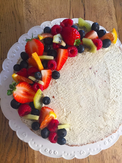 Dividere la torta in due strati, se riusciste anche in tre, e farcire ogni strato con la marmellata, la crema al mascarpone e la frutta fresca tagliata a cubetti molto piccoli.