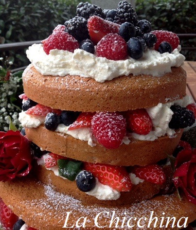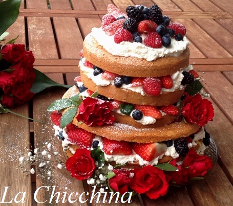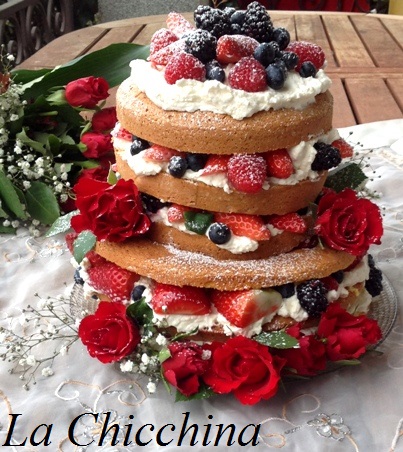 Ho scelto, per il mio compleanno, di preparare una Naked cake (torta nuda) ricca di panna, frutta e fiori…senza risparmio.