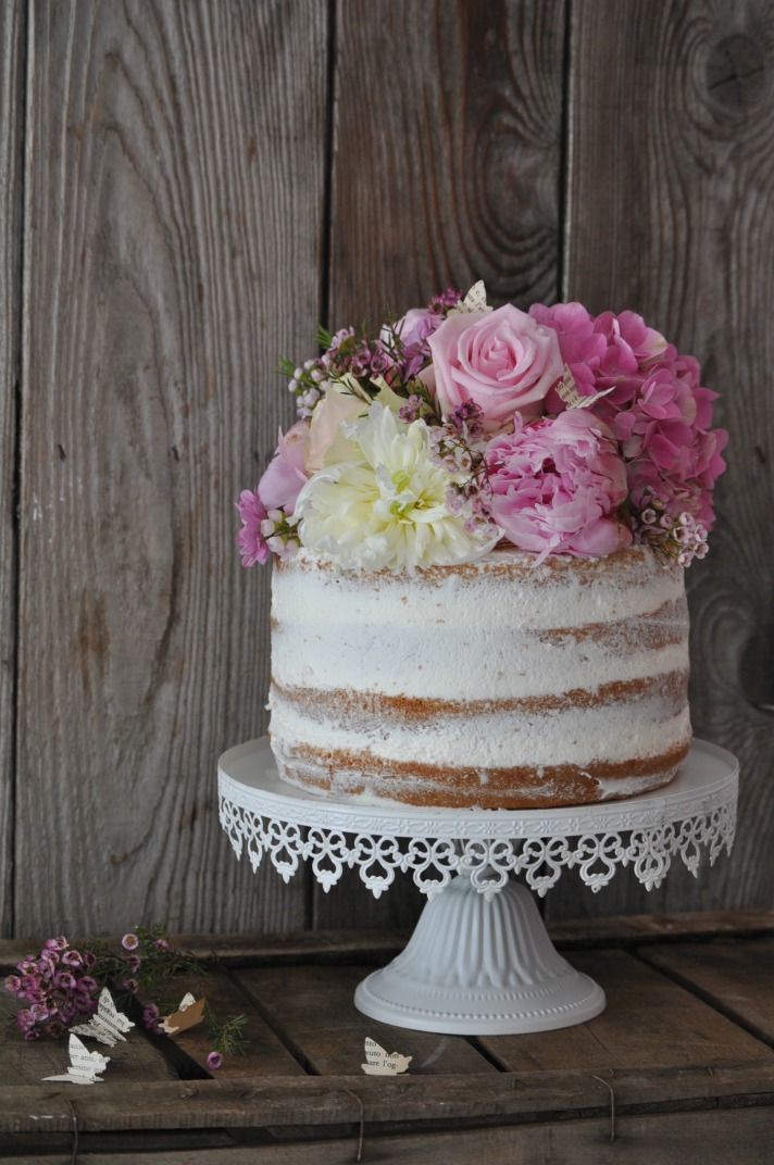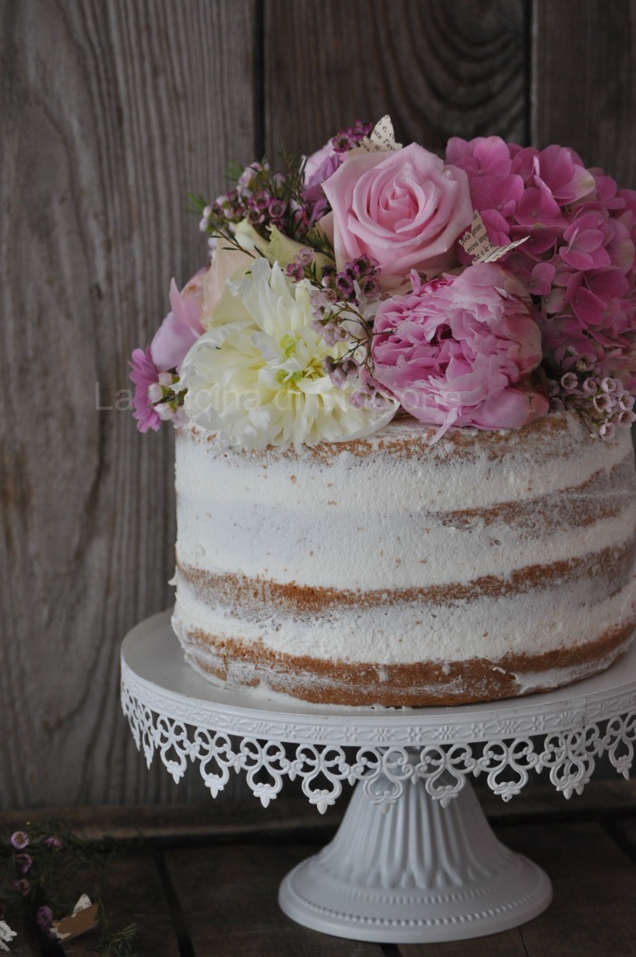 Sfornate e lasciate raffreddare. Dividete la torta in 4 parti uguali con un coltello seghettato. Montate la panna con lo zucchero. Farcite gli strati con abbondante panna montata e con fragoline di bosco (foto 3). Ricoprite non completamente la torta esternamente aiutandovi con una spatola, crendo un effetto “vedo non vedo”. Appoggiate sulle superficie un disco di cartoncino per dolci dello stesso diametro. Decorate con fiori freschi.