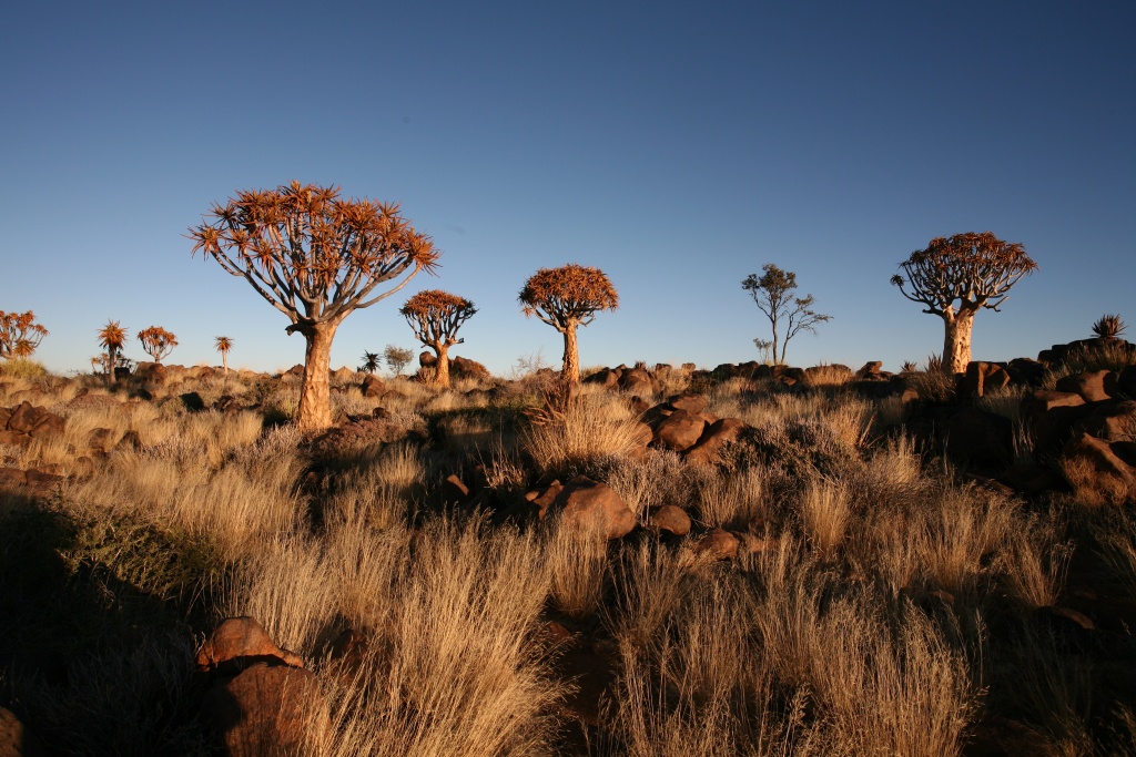 Quiver Tree Forest, la foresta degli alberi faretra, un insieme di piante Aloe dichotoma con il tronco svasato ricoperto da una corteccia molto rugosa dovuta alla siccità e braccia a candelabro ricoperte da foglie carnose che abbracciano i cieli stellati.